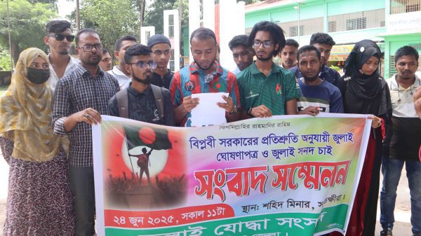 বিপ্লবী সরকারের প্রতিশ্রুতি অনুযায়ী ‘জুলাই ঘোষণাপত্র’ ও ‘জুলাই সনদ’ বাস্তবায়নের দাবিতে সাতক্ষীরায় সংবাদ সম্মেলন করেছে জুলাই যোদ্ধা সংসদ।
